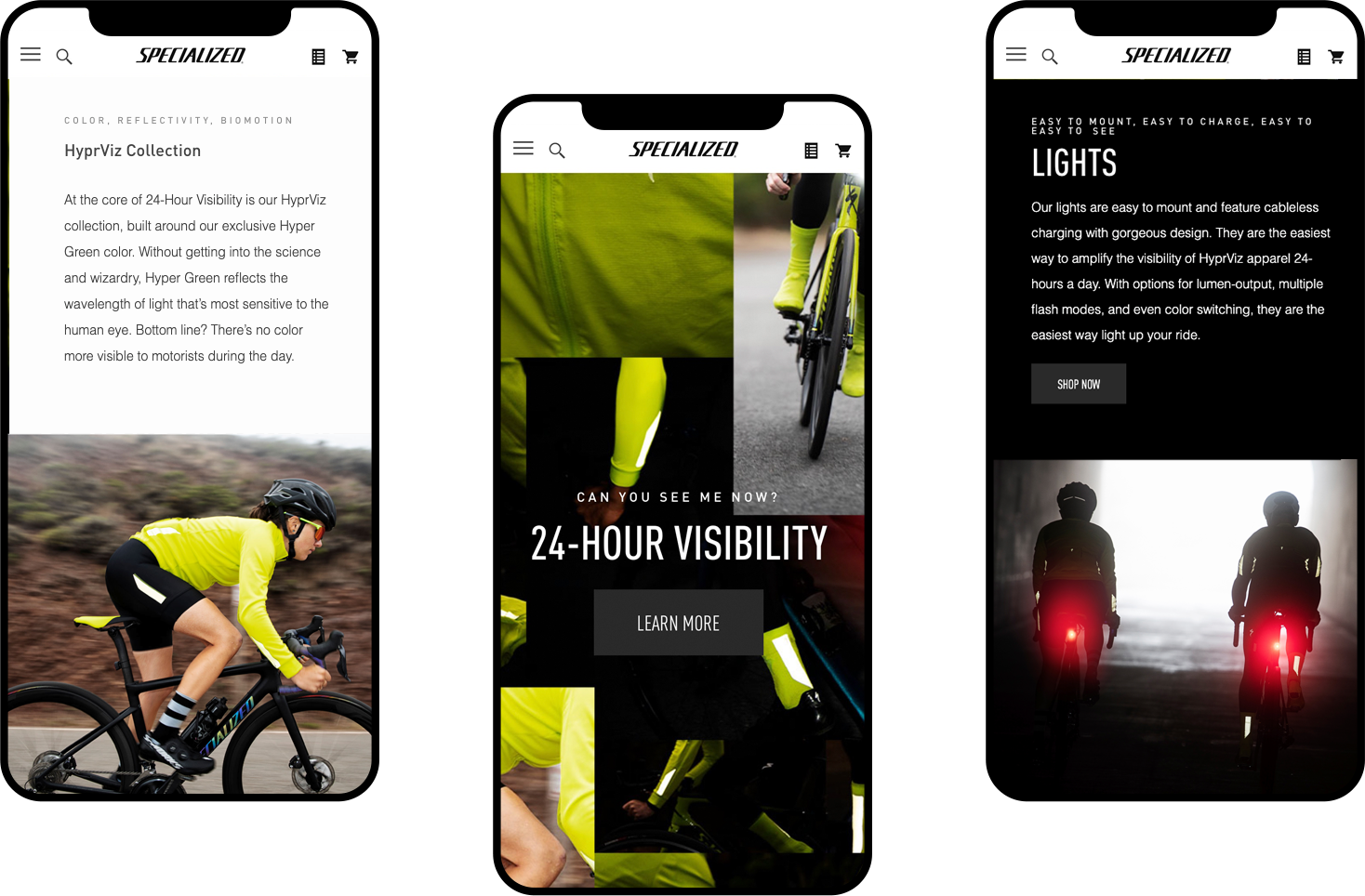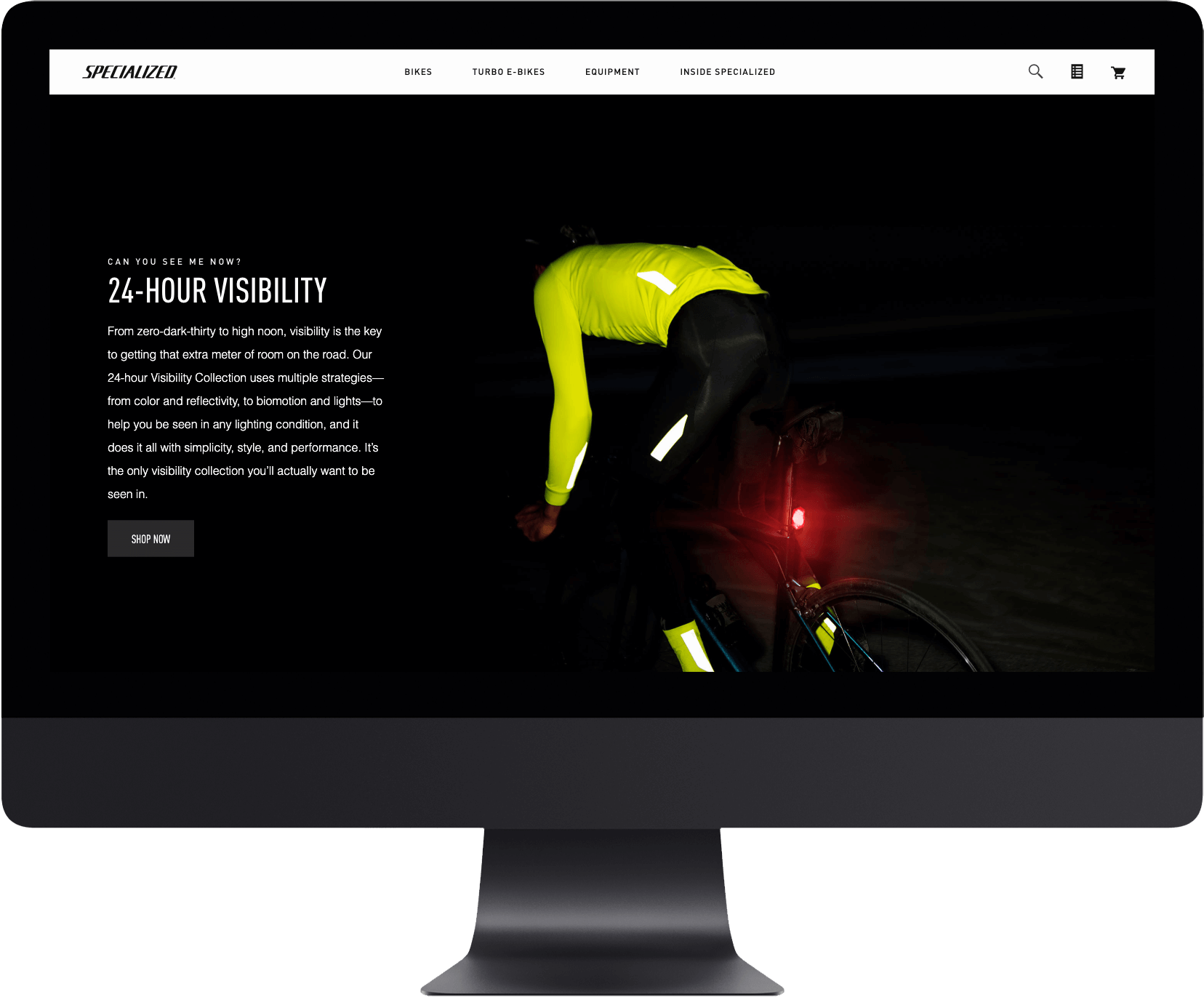 We partnered with Specialized for the global launch of their HyprViz Collection. We crafted a cycling story around the key components of visibility in any light condition: color, reflectivity and biomotion. The video and photo assets were incorporated at retail and on website and social channels.